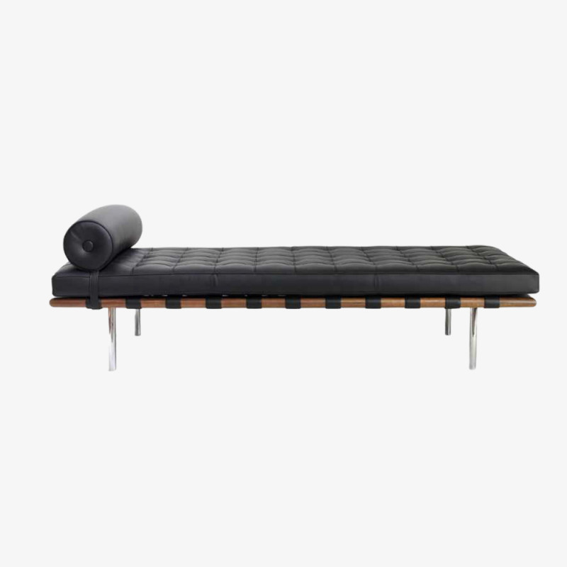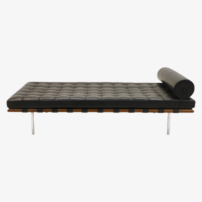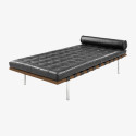 Bench with solid hardwood frame and suspension of heavy leather straps. Legs in chrome plated tubular steel. Mattress and headrest in expanded foam and dacron covered with stitched leather squares. Made in Italy. Iconic Design In 1929 Barcelona was host to the World Arts Fair, and the German government commissioned Mies to design the German Pavilion at Montjuic as part of the exposition. Mies also designed the chairs used in it, the “Barcelona chair”. The chairs served as thrones for the King and Queen of Spain when they visited. The Barcelona bed is an extension of the collection, following the same design principles.