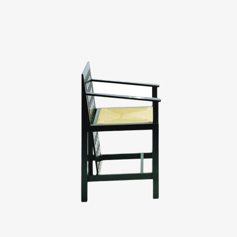 The Hill House dates from 1904 and the chair, one of four originally made for the hall. The sturdy design features the square cutouts and the woven seat pad.