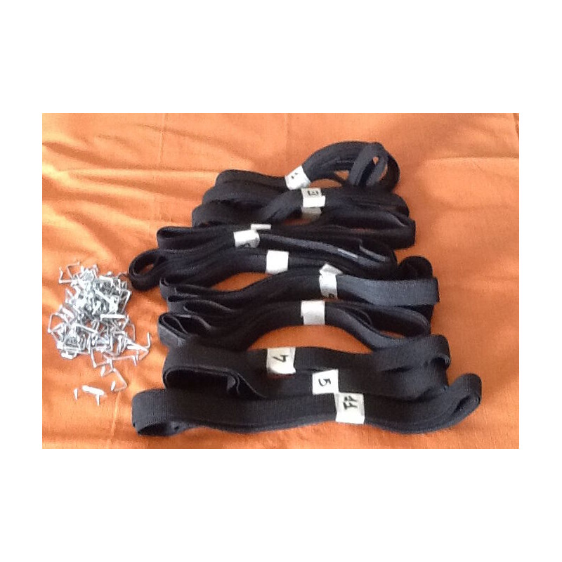 Il set include 5 cinghie per il numero 1 e 3 cinghie per ciascuno degli altri numeri, tutte con una larghezza di 3 cm, per assicurare un'equa distribuzione del supporto su tutta la struttura del divano. Inoltre, sono forniti appositi ganci cromati a doppio gancio, progettati per fissare saldamente le cinghie alla struttura, garantendo stabilità e comfort. Le cinghie elastiche con ganci sono un componente fondamentale per garantire il corretto supporto e la durabilità di divani e chaise longue.